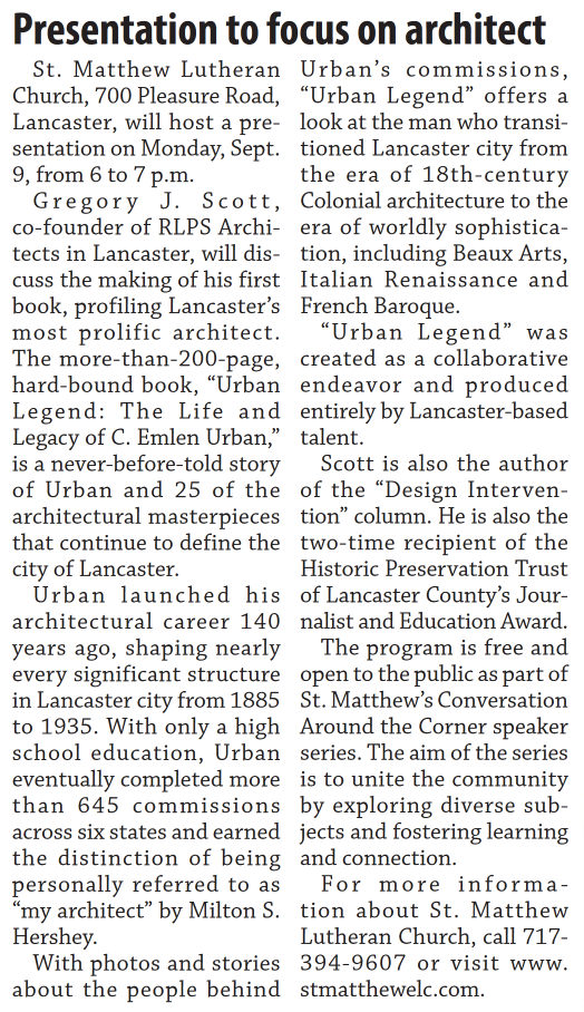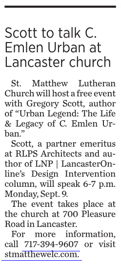 Gregory J. Scott, FAIA, co-founder of RLPS architectural firm in Lancaster, Pennsylvania, has been researching and teaching the community about C. Emlen Urban’s life and architectural legacy for over 20 years. Scott will discuss the making of his first book profiling Lancaster’s most prolific architect. The 200+ page book is titled Urban Legend and is a never-before-told story of C. Emlen Urban and 25 of the architectural masterpieces which left an indelible mark on the City of Lancaster.